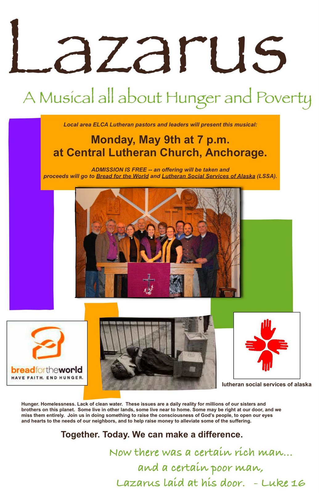 The Lutheran clergy (and a few friends) in my area recently embarked on a musical journey together. We decided to call attention to hunger issues in Alaska and around the world by staging a musical originally produced by Bread for the World. Lazarus: A Musical Call to End Hunger is based loosely on the biblical stories of Lazarus and the Rich Man. In the case of the musical, the Rich Man is offered a chance to change his ways and shares his vision of all eating and being satisfied.